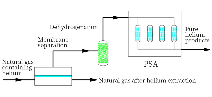 Our company has been committed to the development of helium extraction and purification technology for more than ten years, and has successfully developed the "membrane separation + pressure swing adsorption coupling technology". At present, this technology can be used to extract and purify helium from helium poor natural gas (containing he:0.05%~0.1%), and the purity of product helium can reach more than 99.999% (mol%).
